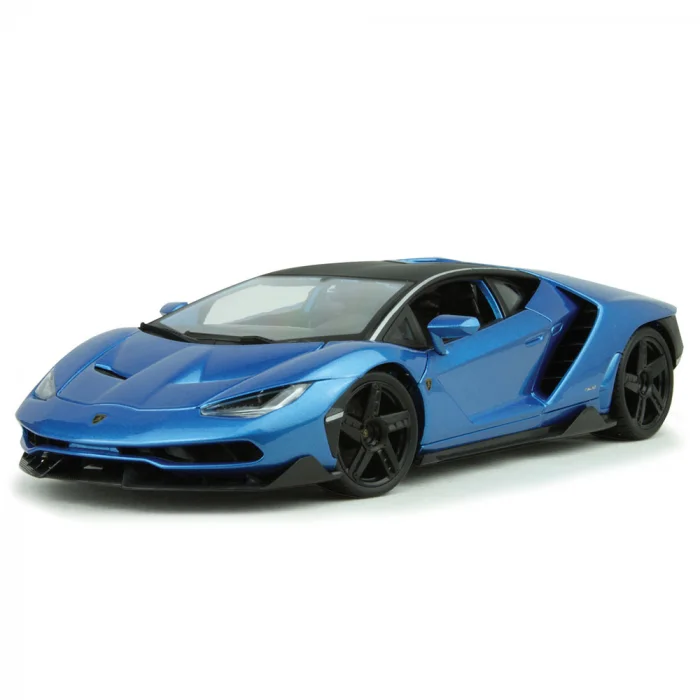Lamborghini Centenario'nun mavi rengi, aracın agresif gövde kitini ve sarı/siyah detaylarını en iyi vurgulayan kontrastı sunar. Orijinal lisanslı kutusunda ve teşhir standı ile birlikte gönderilmektedir.